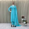 Women’s Georgette Embroidery Sequence Work with Rivet Moti Work Straight Kurti With Pant and Dupatta Set