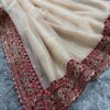 Women’s Exquisite Ivory Tissue Organza Saree with Gold Sequin & Zari Embroidery – Paired with Heavy Maroon Readymade Blouse for Wedding & Festive Wear